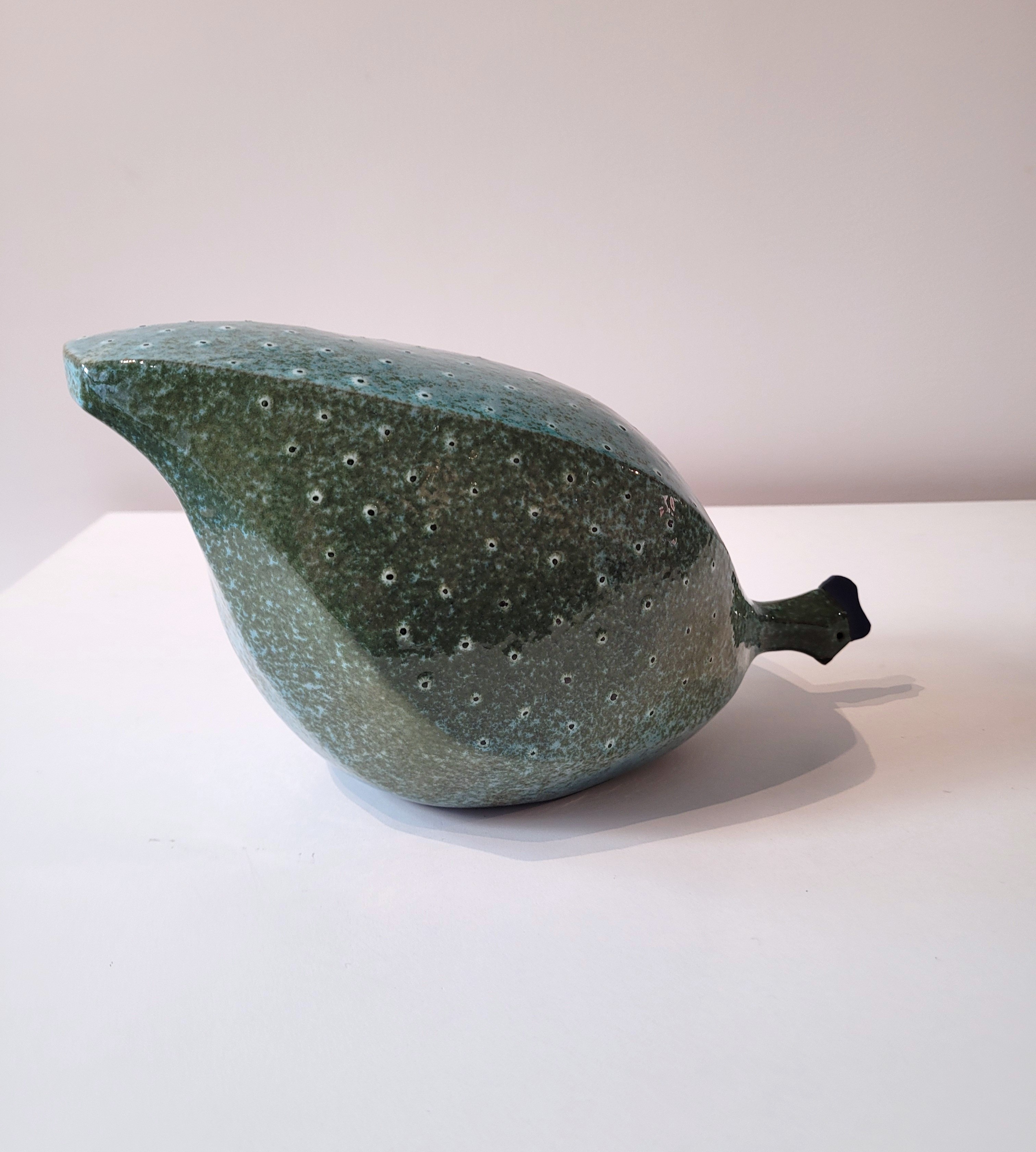 Sculpture en grès émaillé couleur bleu scarabée. Pintade tête basse.